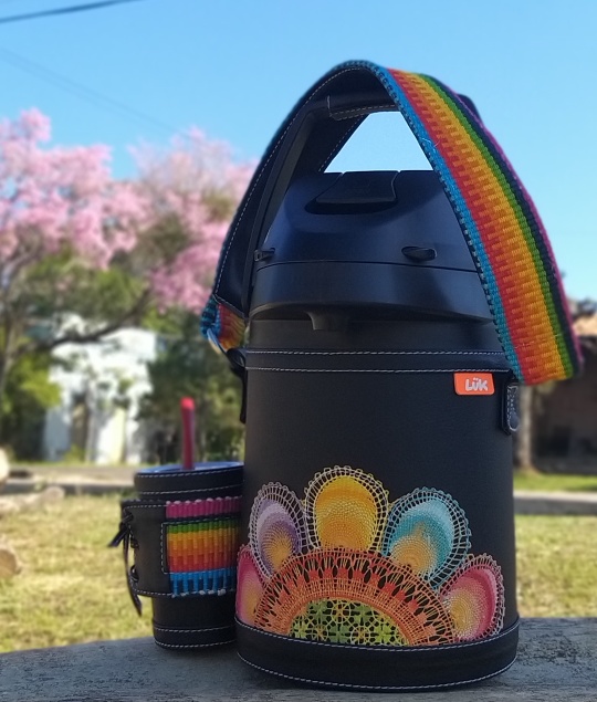 Termo de Acero Inoxidable de 2.5 Litros de capacidad para agua fría / caliente. Termo forrado artesanalmente en cuero símil de alta calidad de color negro con diseño de ñanduti en la parte frontal, lleva faja en la manija. El termo va acompañado de una guampa. No incluye la bombilla. Solicitar presupuesto para envíos nacionales e internacionales.